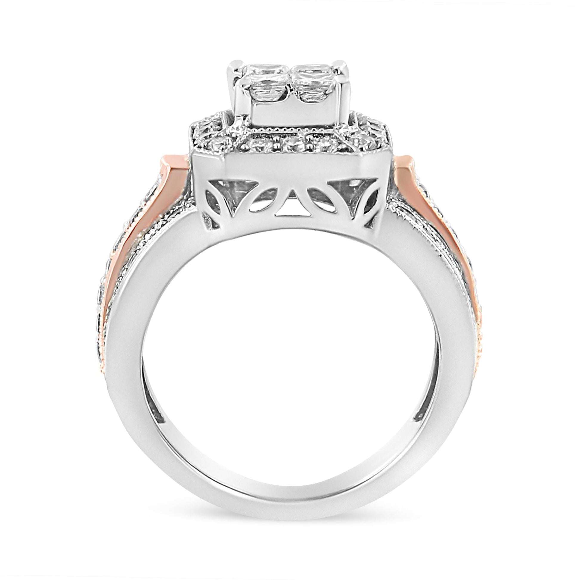 14K White and Rose Gold 1 1/8 Cttw Princess and Round-Cut Diamond Art Deco Style Triple Shank Halo Cocktail Ring (I-J Color, SI2-I1 Clarity)